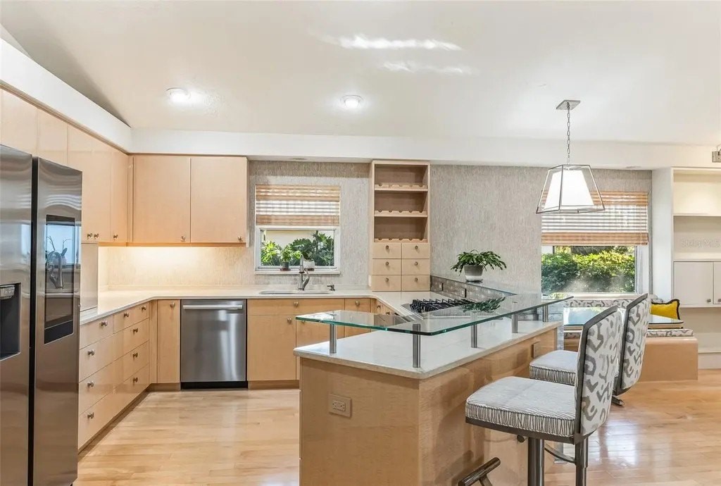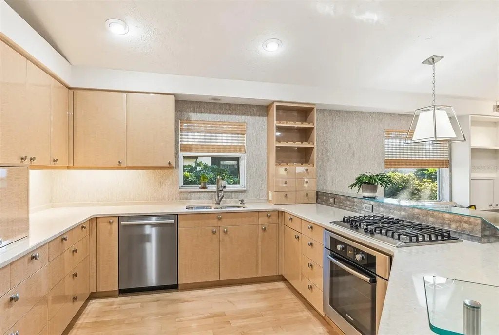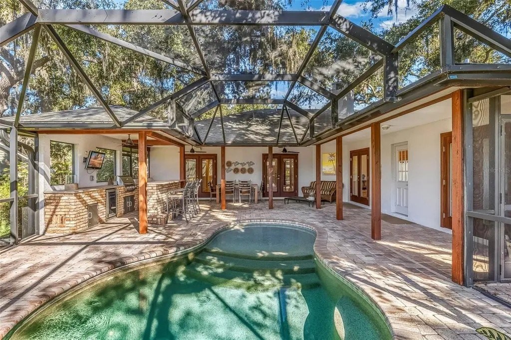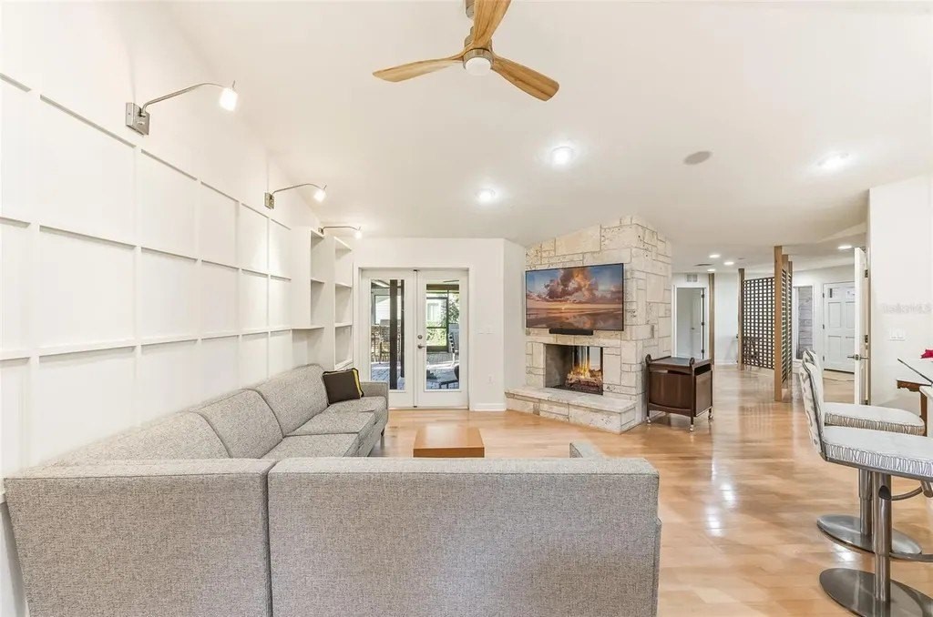 One or more photo(s) has been virtually staged. Discover this stunning three-bedroom, two-and-a-half-bath home nestled on a quiet street in the sought-after Sherwood Forest community. Set on a spacious, beautifully treed lakefront lot, this residence combines serene natural surroundings with elegant modern living. Step inside to find neutral-toned engineered hardwood floors flowing throughout the home, complemented by custom cabinetry and built-ins thoughtfully placed in several rooms. At the heart of the living space, a double-sided gas fireplace set in striking Coral Stone creates a warm and inviting ambiance. The upgraded kitchen features premium Bosch and Samsung appliances, abundant storage, and a charming built-in seat bench and table for casual dining. The luxurious primary suite offers his-and-hers walk-in closets and a spa-inspired bathroom with double sinks and generous storage solutions. Outdoor living is equally impressive, featuring a fully equipped outdoor kitchen with a custom granite bar, cable TV, and a Sonos sound system that extends through the family room, primary bedroom, and lanai-perfect for entertaining or relaxing lakeside. Hurricane Shutters for some of the windows in the home. Roof replaced in 2018. Gorgeous landscaping with Sand Oak Trees, irrigation to keep your St. Augustine lawn pristine. Paver pool area, driveway and walkways. Great central location in town! Not many communities have the larger lots, majestic oaks and winding roads that Sherwood Forest exudes. Enjoy shopping, dining, beaches, the arts and so much more that Sarasota has to offer. A rare opportunity to own a refined home blending comfort, craftsmanship, and lakefront tranquility.