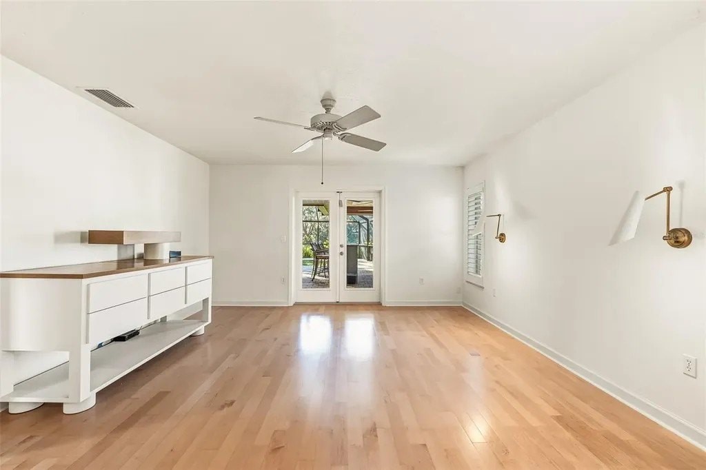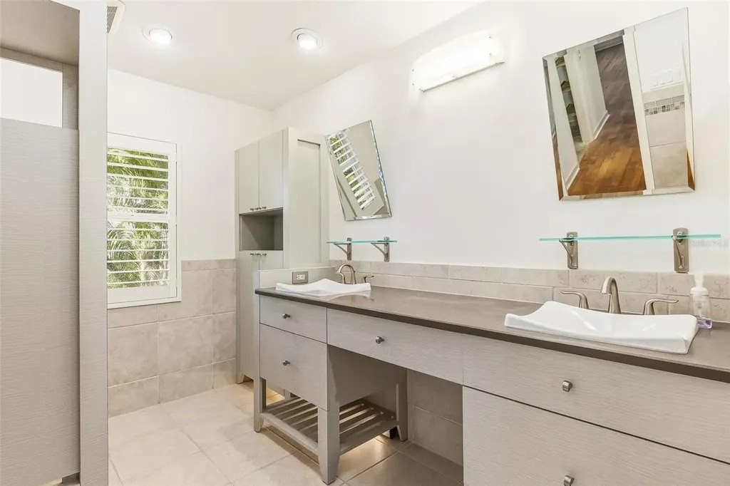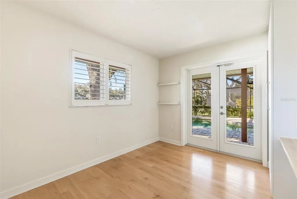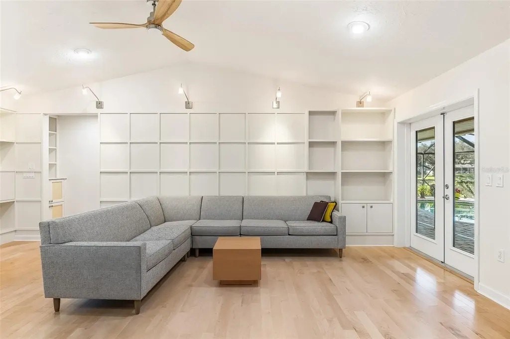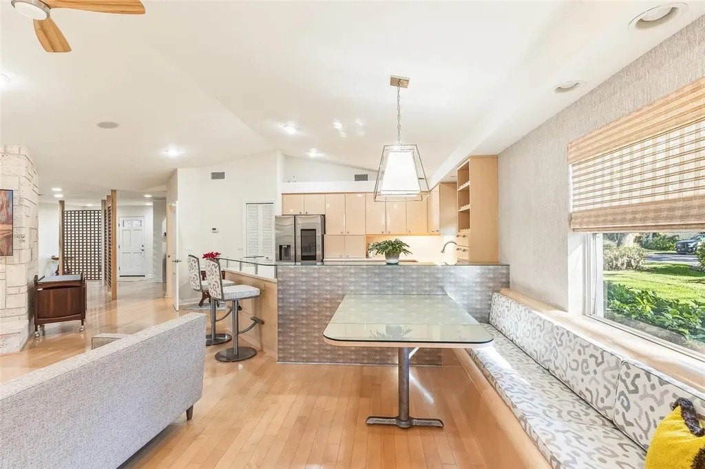 One or more photo(s) has been virtually staged. Discover this stunning three-bedroom, two-and-a-half-bath home nestled on a quiet street in the sought-after Sherwood Forest community. Set on a spacious, beautifully treed lakefront lot, this residence combines serene natural surroundings with elegant modern living. Step inside to find neutral-toned engineered hardwood floors flowing throughout the home, complemented by custom cabinetry and built-ins thoughtfully placed in several rooms. At the heart of the living space, a double-sided gas fireplace set in striking Coral Stone creates a warm and inviting ambiance. The upgraded kitchen features premium Bosch and Samsung appliances, abundant storage, and a charming built-in seat bench and table for casual dining. The luxurious primary suite offers his-and-hers walk-in closets and a spa-inspired bathroom with double sinks and generous storage solutions. Outdoor living is equally impressive, featuring a fully equipped outdoor kitchen with a custom granite bar, cable TV, and a Sonos sound system that extends through the family room, primary bedroom, and lanai-perfect for entertaining or relaxing lakeside. Hurricane Shutters for some of the windows in the home. Roof replaced in 2018. Gorgeous landscaping with Sand Oak Trees, irrigation to keep your St. Augustine lawn pristine. Paver pool area, driveway and walkways. Great central location in town! Not many communities have the larger lots, majestic oaks and winding roads that Sherwood Forest exudes. Enjoy shopping, dining, beaches, the arts and so much more that Sarasota has to offer. A rare opportunity to own a refined home blending comfort, craftsmanship, and lakefront tranquility.